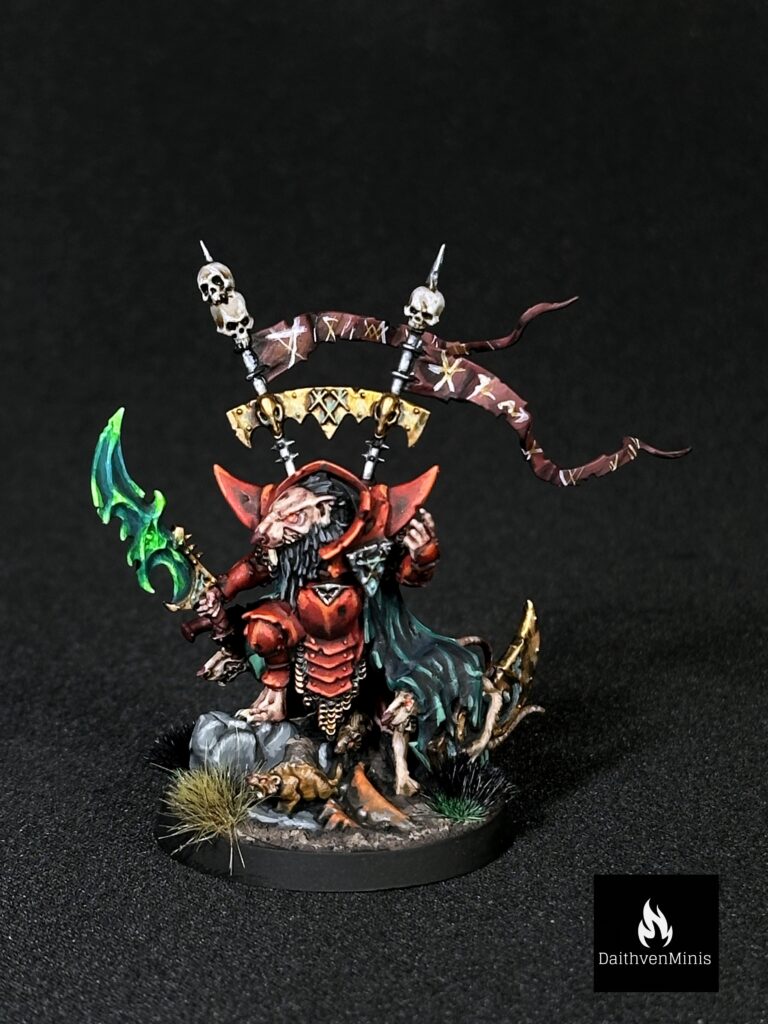 Hero for Skaven army for Age of Sigmar. Krittok Foulblade painted in oryginal red colours and warp sword.